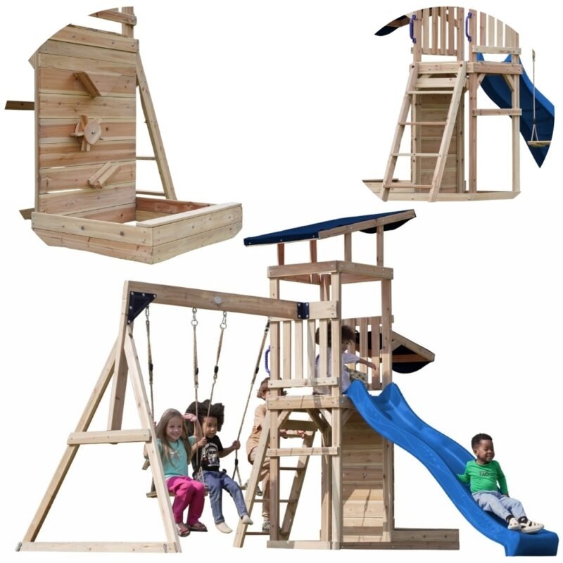 ✔ Dzięki różnorodnym elementom – wieży widokowej, długiej zjeżdżalni, podwójnej huśtawce i piaskownicy – dzieci mogą rozwijać swoją kreatywność, siłę i koordynację ruchową w jednym miejscu!