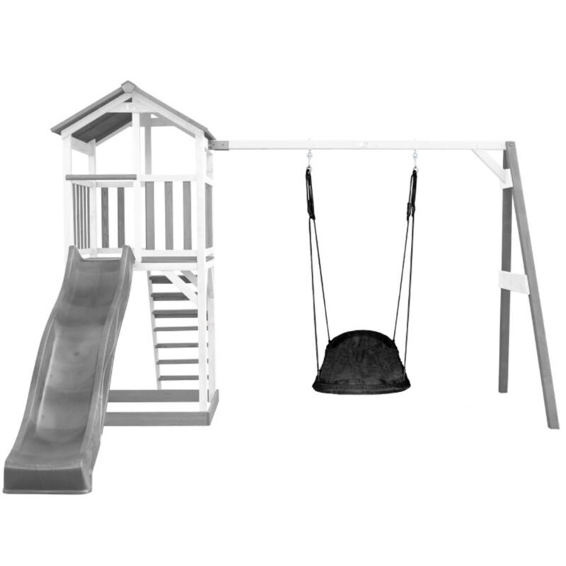Plac zabaw marki AXI to doskonała propozycja również dla mniejszych ogrodów. Zabawa już nigdy nie będzie nudna! Drewniany plac zabaw oferuje wiele możliwości zabawy. Znajdziemy tu platformę z pofalowaną szarą zjeżdżalnią, na którą dostać się można dzięki bezpiecznej drabince, która pełni również rolę ściany wspinaczkowej. Całość przykrywa szary daszek, który zapewni dziecku schronienie przed słońcem. W dolnej części znajdziemy piaskownicę, oraz solidną huśtawkę.