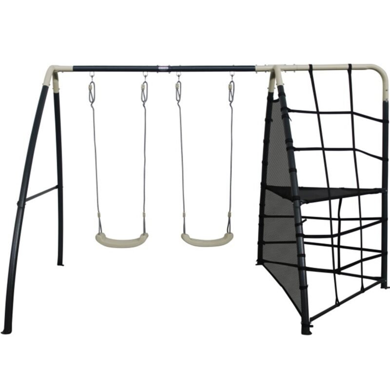 Zapewnij dzieciom niezapomniane chwile na świeżym powietrzu z podwójną huśtawką Axi! Ten wszechstronny zestaw łączy w sobie dwie klasyczne huśtawki i pełną wyzwań siatkę do wspinaczki, dzięki czemu maluchy od 3. roku życia mogą w pełni rozwijać swoją zręczność i koordynację.