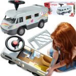 Jeździk Kamper od renomowanej firmy BIG to pojazd przypominający prawdziwy samochód kempingowy. Jest stabilny i bezpieczny – idealny dla dzieci, które zaczynają swoją przygodę z pojazdami. Zdejmowany dach kampera skrywa przestronne wnętrze, które zapewnia wystarczająco dużo miejsca na figurki do zabawy i lalki do 12 cm. Mogą towarzyszyć małym poszukiwaczom przygód w ich wycieczkach i zawsze są gotowi dotrzymać im towarzystwa podczas krótkich przerw na odpoczynek. Zabawne naklejki umożliwiają indywidualny projekt. Kamper BIG jest również wyposażony w wysokiej jakości ciche koła, które są szczególnie lubiane przez rodziców i które pozwalają małym kierowcom spokojnie jeździć po ogrodach i pokojach dziecięcych. Dzięki wyjątkowo miękkim, niebrudzącym plastikowym oponom nie ma również ryzyka pozostawienia śladów na podłodze, dlatego kamper jest również idealny do użytku w pomieszczeniach. Jeździk zbudowany tak, aby dzieci mogły wypróbować i rozwijać kolejne zdolności – wsiadanie, zsiadanie, odpychanie i kierowanie. Jest to idealna propozycja na prezent dla dziecka od 2 roku życia.
