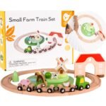 - – zestaw zawiera drewniany tor, pociąg z wagonami, stację, młyn, figury zwierząt, łąkę dla zwierząt