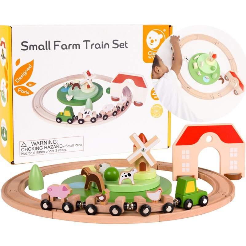 - – zestaw zawiera drewniany tor, pociąg z wagonami, stację, młyn, figury zwierząt, łąkę dla zwierząt