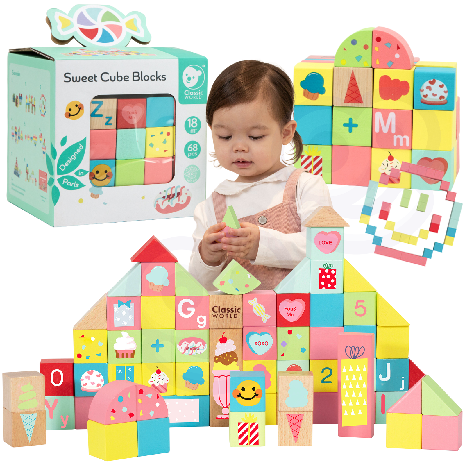 Zestaw klocków drewnianych od marki CLASSIC WORLD to klasyczna zabawka skutecznie rozwijająca intelekt dziecka. Wspiera zabawę konstrukcyjną, dążenie do celu, kreatywność, rozwiązywanie problemów i podstawy STEM. Zabawka składa się z 68 różnych klocków. Można na nich wykonywać działania matematyczne, uczyć alfabetu i analizować obrazki. Taka zabawa wspiera świadomość przestrzenną, naukę kolorów, kształtów, rozmiarów i funkcjonalności. Zapakowane w kartonowe ładne pudełko idealnie pasujące na prezent.