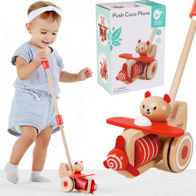 Drewniany Pchacz Samolot Coco Classic World to idealna zabawka dla najmłodszych, którzy stawiają swoje pierwsze kroki. Nie wymaga baterii. Dzięki swej prostocie pomoże w rozwoju wyobraźni twojego dziecka oraz zapewni świetną zabawę przez długi czas. Pchnij samolot by miś Coco odleciał i rozpoczął zabawę Twojego malucha. Jego śmigło zacznie się obracać wytwarzając zabawny dźwięk. Zapewnij swojemu maluchowi zabawę w małego pilota.