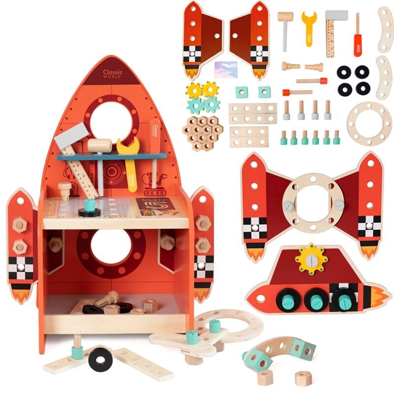 Drewniany Warsztat Statek Kosmiczny od marki Classic World to bardzo ciekawy zestaw zabawek dla małego majsterkowicza, którego ambicją jest dotarcie do gwiazd. Zabawa w majsterkowanie wspomoże rozwój zdolności manualnych, zaciekawi i pobudzi wyobraźnię dziecka. Od teraz każdy maluch będzie miał wszystko co mu potrzebne do reperowania, skręcania, zbijania i wszelkich prac remontowych. Załączone narzędzia pozwolą na ulepszenia i naprawę dużej rakiety czy też stworzenie własnych statków kosmicznych z załączonych silników oraz innych elementów. Zestaw został wykonany z wysokiej jakości drewna, nie zawiera ostrych krawędzi, dzięki czemu jest bezpieczny dla dzieci.