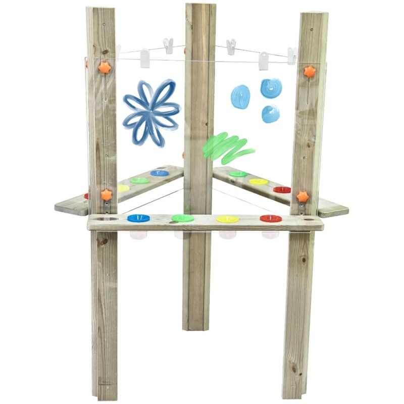 - – Pod każdą tablicą zamontowano praktyczną półkę z miejscem na cztery kubki z farbą lub kredkami. Kubeczki można łatwo organizować według kolorów, co utrzymuje porządek i rozwija nawyki pracy w zespole