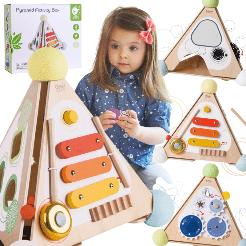 Drewniana Piramida Activity Box od renomowanej marki Classic World to idealna zabawka na poszerzenie zdolności motorycznych twojego dziecka. Zaprojektowane w kreatywnej konstrukcji czworościanu, pudełko odkrywcze można przesuwać w dowolnym kierunku, dzięki zamontowanym kółkom na rogach. Dzięki pięknym kolorom twoje dziecko nie będzie mogło się oderwać od tej edukacyjnej zabawy!