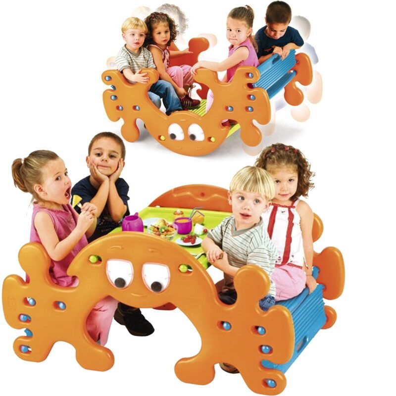 Stolik – bujak firmy Feber z oczami, które poruszają się podczas bujania to doskonałe uzupełnienie przydomowego placu zabaw. Stolik po odwróceniu przekształca się w huśtawkę – bujak. Zabawka wyposażona została w 4 wygodne miejsca do siedzenia. Całość wykonana jest z wysokiej jakości tworzywa odpornego na działanie warunków atmosferycznych i promieni UV. Sposób wykonania sprawia, że przyciąga wzrok każdego malucha. Radość dziecka gwarantowana!