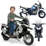 Motocykl BMW R1250 GS Adventure na akumulator 24 V cenionej marki INJUSA, polecany jest dla dzieci od 6 roku życia. Jego główne cechy to metalowe felgi z 12-calowymi nadmuchiwanymi kołami, które umożliwiają poruszanie się po niestabilnych powierzchniach. Urządzenie bardzo realistyczne i spektakularne z najlepszymi dodatkami, pierwszym akceleratorem i hamulcem bębnowym. Pojazd osiąga prędkość 11 km/h. Zawiera przycisk rozrusznika, przednie i tylne światła LED, które są aktywowane podczas uruchamiania motocykla oraz stojak. Maksymalna obsługiwana waga: 50 kg.