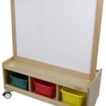 Tablica umieszczona została na wygodnym drewnianym statywie, który świetnie sprawdza się w warunkach szkolnych i przedszkolnych, ale ułatwia również przenoszenie i przechowywanie w domu. Statyw posiada miejsce na przechowywanie gąbek, markerów, kredy, oraz magnesów do przyczepiania na tablicę.