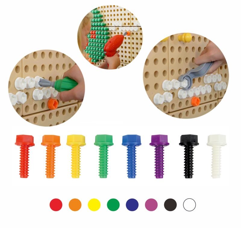 - – Śrubki nie tylko świetnie uzupełnią tablicę, zapełniając ją nowymi kolorami, ale dzięki temu, że można je wkręcać przy pomocy specjalnych narzędzi (które należy zakupić osobno) Twoje dziecko nauczy się używać śrubokrętów, kluczy, a także elektronicznej wkrętarki z różnymi końcówkami.