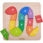 Drewniany wąż to idealny przyjaciel dziecka, które uczy się liczenia. Zwierzak podzielony jest na 11 kolorowych segmentów, które podpisane zostały cyferkami od 0 do 10. Zadaniem dziecka jest ułożenie węża z dostępnych elementów w specjalnym polu na drewnianej planszy. Plansza podpowiada kolejność cyferek, ale dziecko musi wykazać się skupieniem i zapamiętać kolejność liczb.