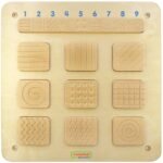 Tablice sensoryczne to świetne zabawki, dzięki którym stymulowane są zmysły maluchów. W przypadku tablicy Rozpoznawanie Faktury, rozwijany jest zmysł dotyku, dzięki czemu później skuteczniej może być wykorzystywany przy poznawaniu otoczenia. Zabawa polega na tym, by z zamkniętymi oczami odnaleźć parę pasujących do siebie fakturą płytek. Zadanie nie jest tak proste, jak może się wydawać, a dziecko musi się bardzo skupić i wysilić zmysły.