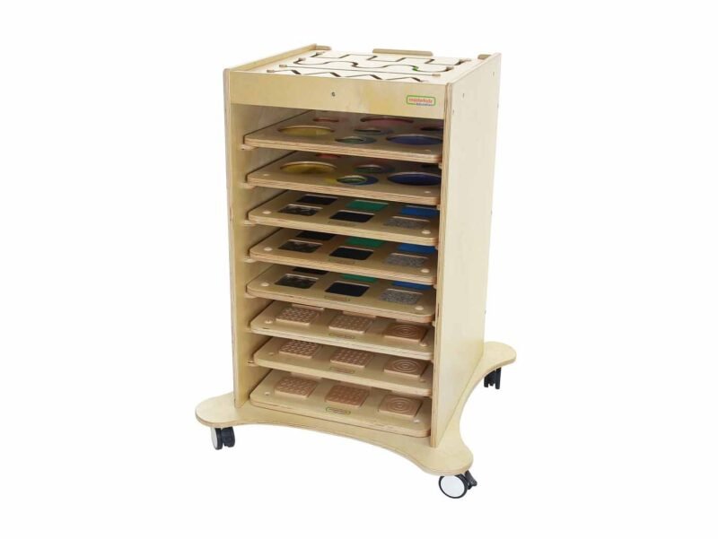 Mobilna szafka na kółkach do przechowywania tablic ściennych Masterkidz to świetny mebel, który pozwoli na zachowanie należytego porządku wśród ściennych tablic edukacyjnych od Masterkidz o wymiarach 46x46cm – mieści ich aż 9.