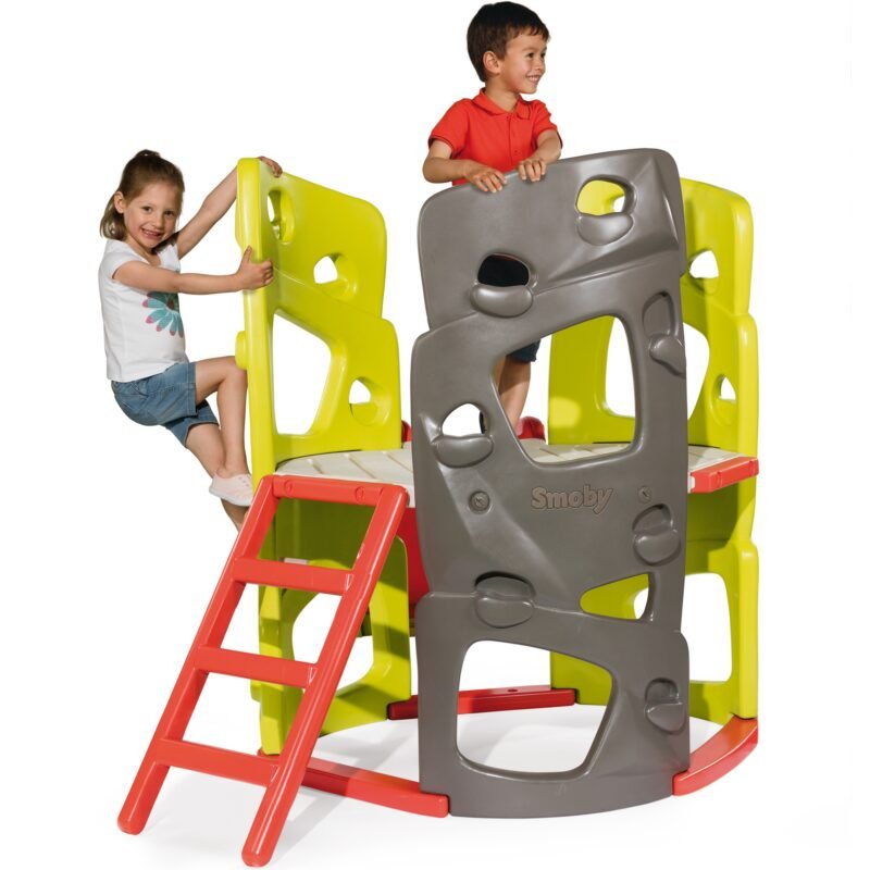 Wieża wspinaczkowa plac zabaw zjeżdżalnia od cenionego francuskiego producenta zabawek dla dzieci firmy Smoby. Maluchy mogą się wspinać, zjeżdżać, wchodzić po drabince, bawić się w chowanego. Na podest dzieci mogą wejść po drabince lub specjalnie do tego stworzonych 3 ściankach do wspinaczki, które posiadają idealne dla dziecięcych dłoni i stóp uchwyty.