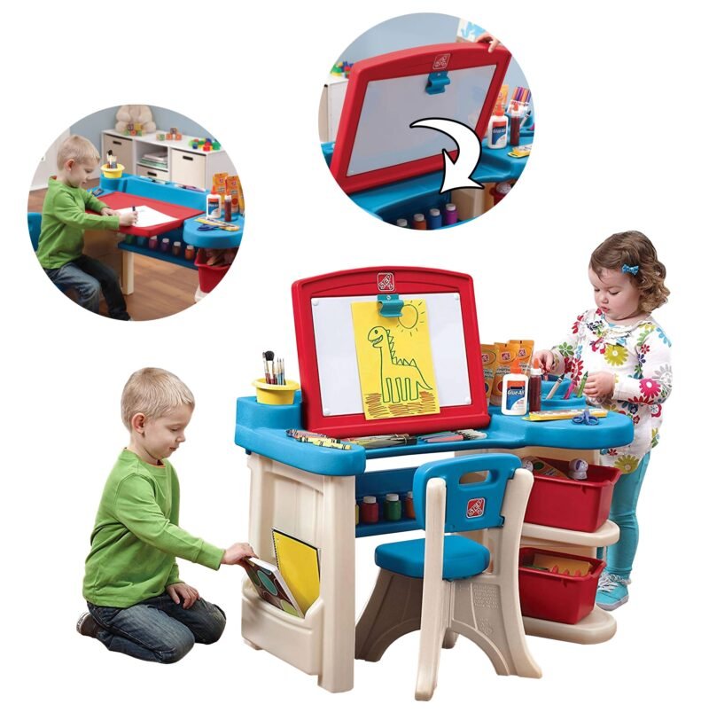 Stabilne biurko z ogromną ilością przegródek i schowków gwarantuje utrzymanie miejsca pracy dziecka zawsze w należytym porządku. Natomiast duża powierzchnia robocza 33 x 51 cm zapewni mu komfort i wygodę podczas użytkowania. Biurko posiada mocowany ruchomy blat, który jest zarazem sucho ścieralną tablicą wielokrotnego użytku, na której dzieci mogą pisać flamastrami. W bocznej ściance biurka wbudowana jest półka w której dziecko może przechowywać swoje malunki, rysunki.