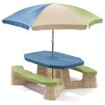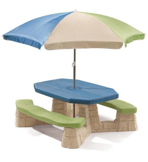Stół piknikowy dla sześciorga dzieci z dwoma ławeczkami o specjalnym wyprofilowanym siedzisku. Wykonany z masywnego tworzywa sztucznego o podwójnych ściankach wypełnionych w środku powietrzem.Znaczna grubość elementów minimum 5 – 6 cm pozwala na długie użytkowanie stolika, a duży ponad 100 cm długości i szerokości 50 cm masywny blat oraz stabilna konstrukcja stołu zapewnia bezpieczeństwo zabawy. Dołączony parasol chroni przed promieniowaniem UV. Wysokość od ziemi do blatu stolika minimum 50 cm pozwala na korzystanie ze stolika dzieciom o różnym wzroście.