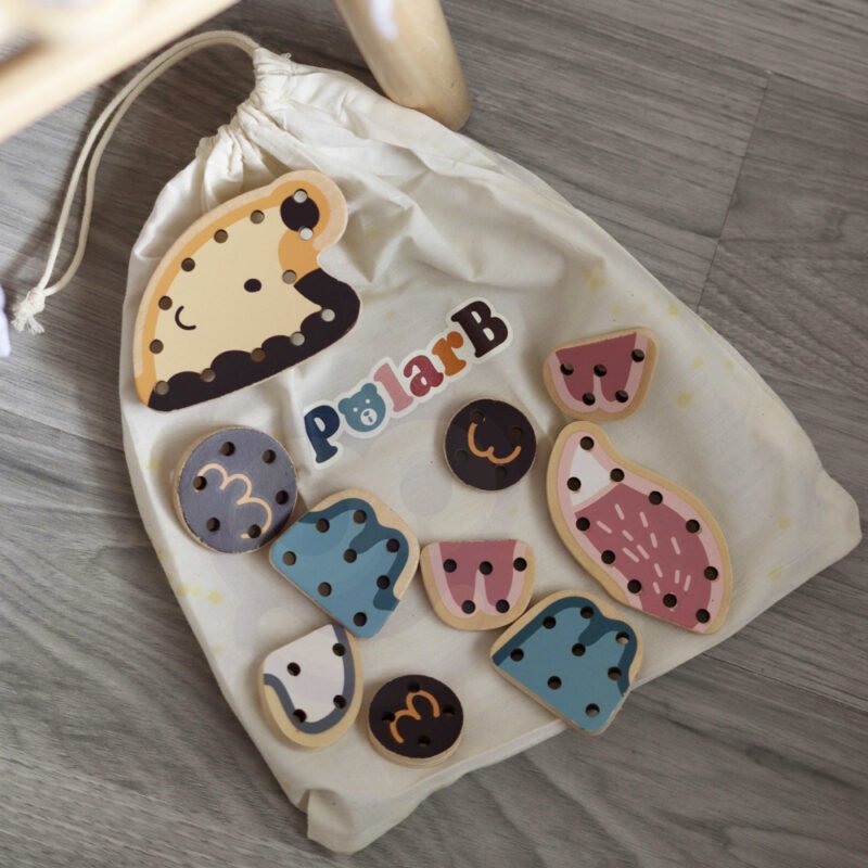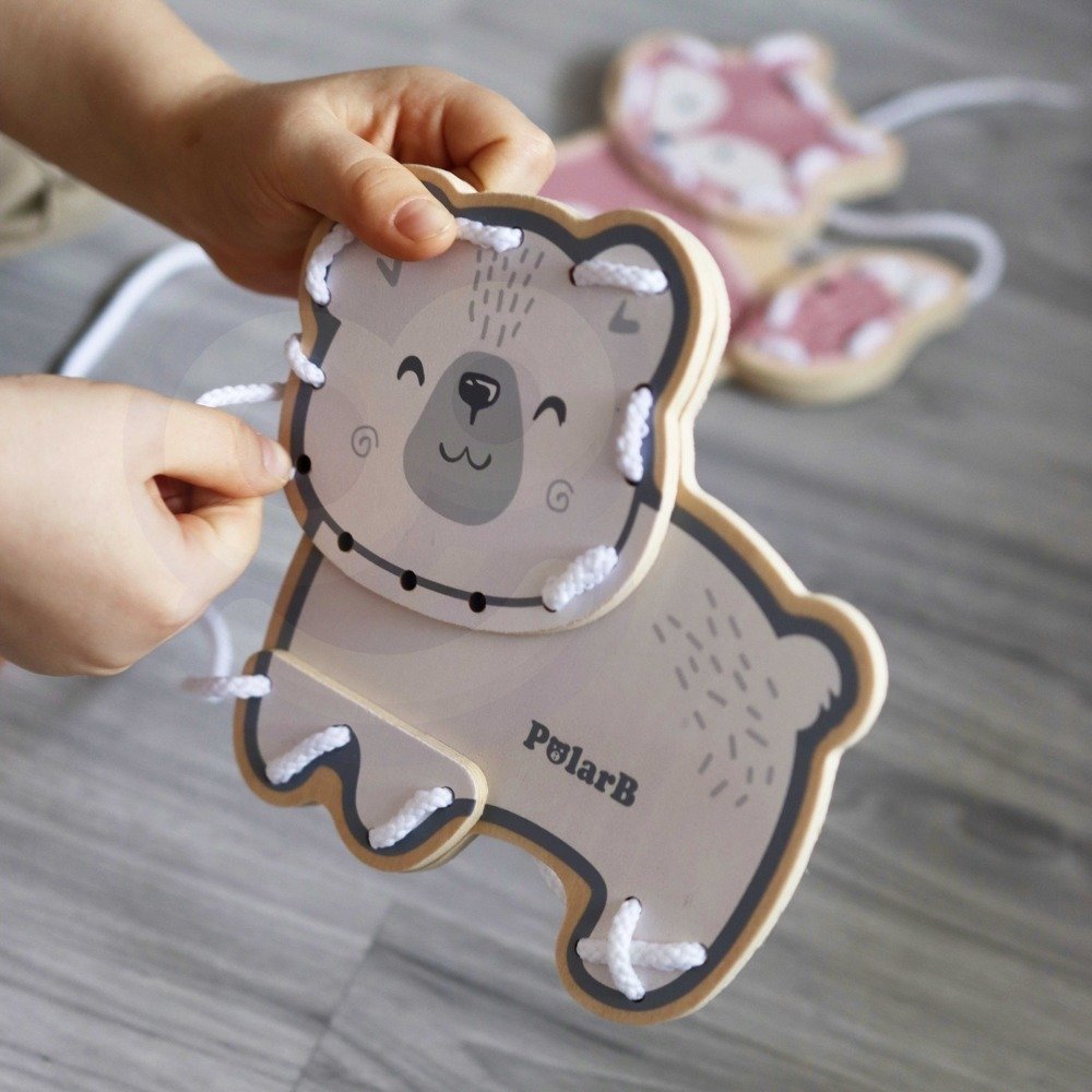 Šį smulkiosios motorikos lavinimui skirtą rinkinį sudaro 4 gyvūnai ir 4 skirtingų spalvų siūlai. Vaiko užduotis yra parinkus reikiamos spalvos siūlus priderinti galvą, kojas, ausis ar uodegą prie gyvūno kūno ir sujungti juos virvele, kad gautųsi trimačiai gyvūnai,