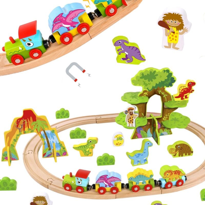 Drewniana Kolejka Dinozaury marki Tooky Toy to zabawka, która zrobiona jest z najwyższej jakości drewna, dzięki czemu posłuży twojemu dziecku na lata zabawy. Dzięki temu zestawowi Twoje dziecko może wyobrazić sobie jazdę pociągiem przez prehistoryczny świat, w którym współistnieją dinozaury i ludzie! Szyny łatwo się łączą, a pociąg może ciągnąć trzy wagony, które mocuje się magnetycznie, a każdy z nich może pomieścić minifigurkę i inne akcesoria z zestawu. Kolorowa kolejka z akcesoriami cieszy oko i zachęca do zabawy. Kolejka jest całkowicie bezpieczna, nie posiada ostrych krawędzi, ponad to pomalowana jest nietoksyczną farbą.