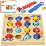 Tooky Toy Drewniany Stół Latające Rybki – jest grą gdzie musimy umieścić kolorową rybkę na specjalnej platformie oznaczonej odpowiednim kolorem. Naciśnij specjalny obszar platformy i wystrzel rybkę. Świetna zabawa dla jednej bądź wielu osób. Baw się z przyjaciółmi lub rodziną i bądź pierwszym, który ułoży jak największą liczbę rybek w specjalnie przygotowanych dołkach na platformie. W zestawie znajdziemy drewnianą platformę oznaczoną różnymi kolorami, 16 kolorowych rybek oraz 2 platformy abyśmy mogli cieszyć się w pełni grą.