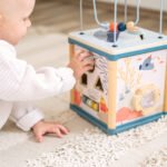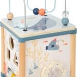 Iš tvirtos medienos pagamintas žavias piešiniais išdailintas veiklos kubas turi 5 puses žaidimams ir veikloms – karoliukų labirintą, formų rūšiavimą, skaitliukus, krumpliaračių žaidimą, slankiojančius elementus, barškutį, veidrodėlį. O pati smagiausia veikla – žvejyba su magnetine meškere!