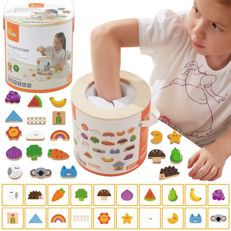Gra w ciemno od firmy Viga nie tylko zapewni dziecku rozrywkę, ale także rozwinie niezbędne umiejętności potrzebne w szkole. Gra zawiera 20 pięknie wykonanych, kolorowych klocków z drewna, 20 kart do gry oraz opakowania z wyciętą dziurką przez, którą dziecko bawi się w „dotknij i poczuj” służy ono też do przechowywania.