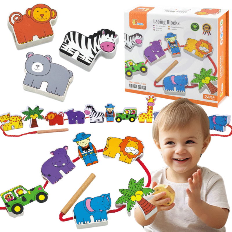 Piękne, kolorowe klocki do nawlekania zachęcają do zabawy. Każdy z 12 elementów został pomalowany dokładnie z obydwu stron. W zestawie znajduje się sznureczek z drewnianym kołeczkiem, który służy do nawlekania klocków w dowolnej kolejności. Klocki przedstawiają mieszkańców ZOO/Safari, samochód Jeepa, palmę oraz pana przewodnika – wszystko, aby jak najlepiej poznać mieszkańców Safari