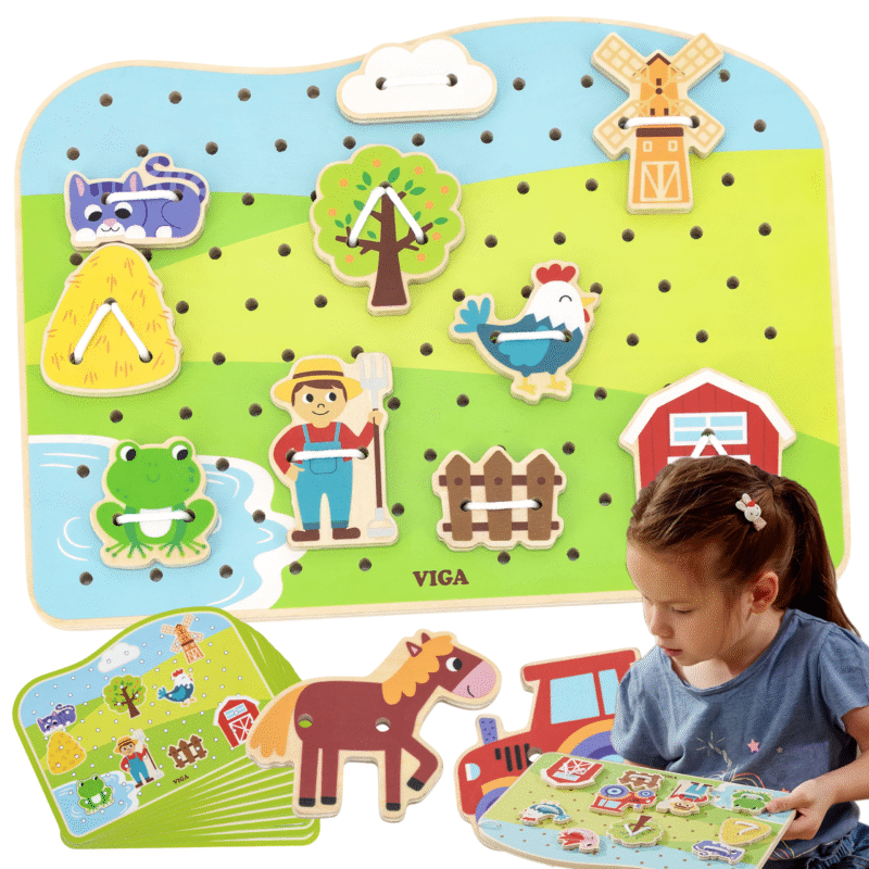 Drewniane Przeplatanki – Sznurowanki od firmy Viga sprawdzą się znakomicie jako narzędzie doskonalenia małej motoryki. Mała motoryka odpowiada za precyzję, koordynację oraz siłę dłoni (kluczową rolę odgrywają tu mięśnie krótkie). Sprawna rączka dobrze chwyta przedmioty, umożliwia zapięcie guzika, prawidłowe chwycenie łyżki, picie bez rozlewania, a w późniejszym etapie wzrostu dziecka wpływa pozytywnie na naukę pisania i rysowania.