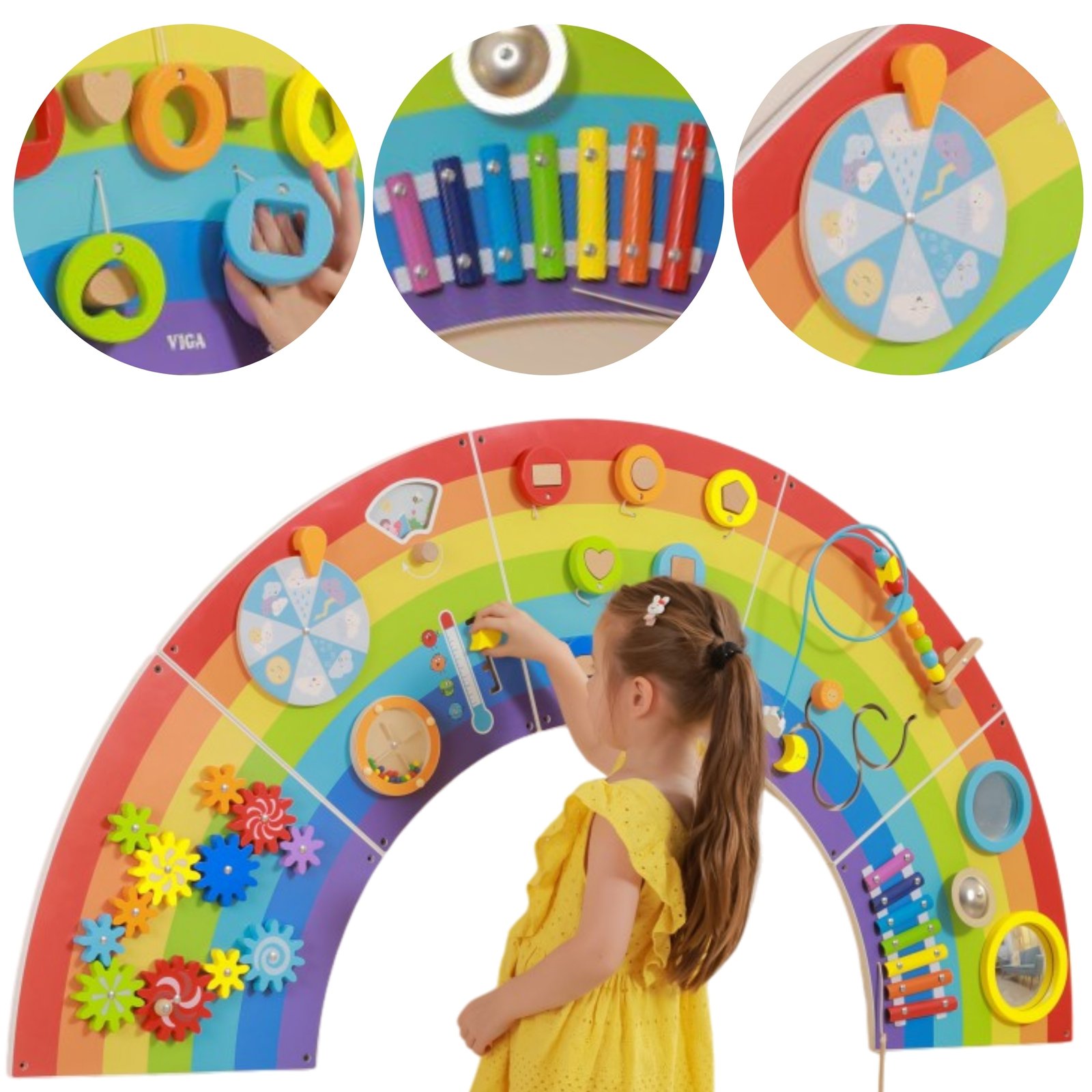 Tablica Sensoryczno – Manipulacyjna Tęcza marki Viga Toys to drewniana, wielofunkcyjna zabawka na ścianę, która zapewni dzieciom godziny świetnej zabawy. Wśród różnych aktywności znajdziesz tutaj 12 czynności: obracające się koła zębate, tablicę pogody, toczący się dysk, dopasowanie klocków, ksylofon, wklęsłe i wypukłe lustro, gong i przeplatanka koralików. Tablica pogody została specjalnie zaprojektowana, aby pasowała do motywu tęczy. Zmieniający się panel pór roku można badać w połączeniu ze zmianami pogody i wahaniami temperatury. Podzielony na 5 części dla łatwego transportu i montażu. Wszystkie 5 części są tej samej wielkości, dzięki czemu można je montować w dowolnej kolejności. Zakrzywiona konstrukcja zachęca dzieci o różnym wzroście do jednoczesnej zabawy i nauki podstawowych pojęć dotyczących kolorów, kształtów, dźwięków i pogody. Zabawka została zaprojektowana tak, aby stymulować zmysły i wspierać rozwój motoryki dziecka. To doskonałe ćwiczenie zręczności małych paluszków. Zabawka uczy również logicznego myślenia oraz cierpliwości. Idealne uzupełnienie środowiska wczesnej nauki i placówek opieki nad dziećmi.