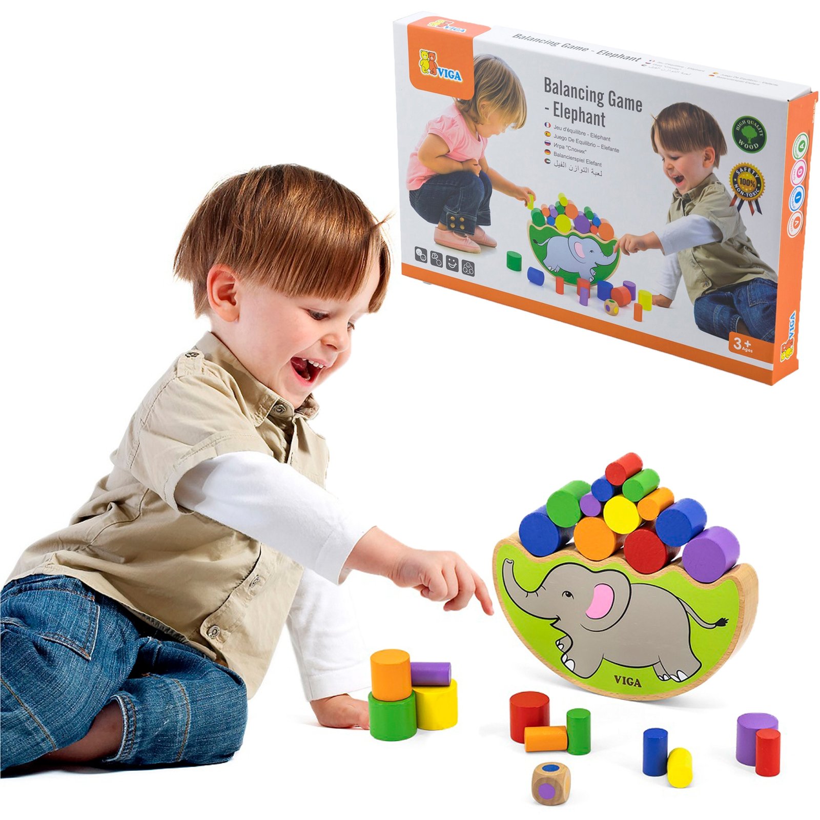 - – zestaw zawiera: słonika, 24 drewnianych cylindrycznych klocków w różnych kolorach i w trzech rozmiarach oraz kostkę,