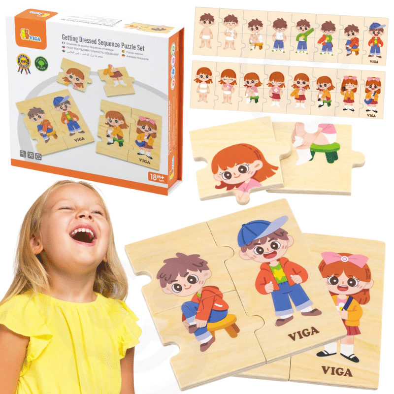 Ta edukacyjna układanka od marki VIGA składająca się z 28 części pomoże małym dzieciom nauczyć się ubierać we właściwej kolejności, co jest podstawową umiejętnością życiową wymaganą we wczesnym dzieciństwie. Drewniana konstrukcja układanki jest wytrzymała i bezpieczna dla dzieci. Części układanki są idealnie dopasowane do siebie.