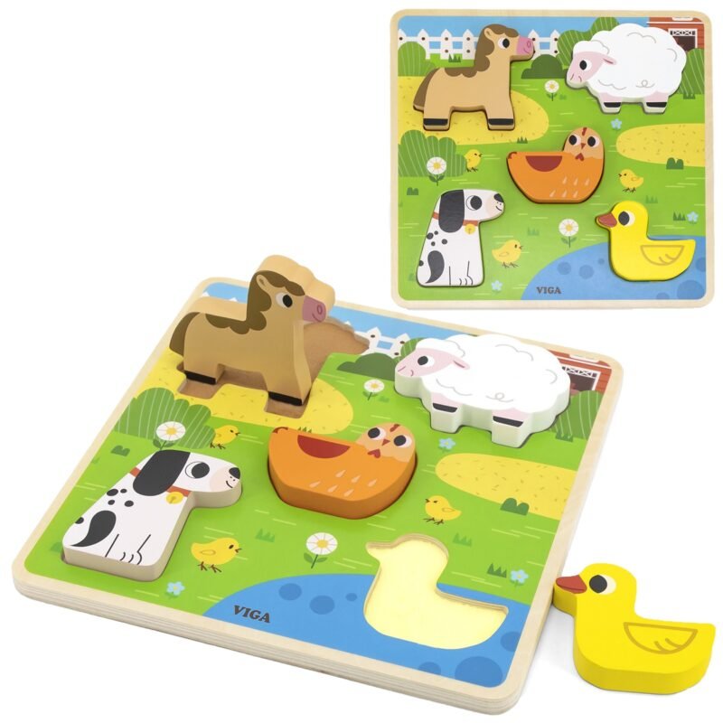 Klasyczne Drewniane Puzzle od marki VIGA w motywie farmy. W zestawie znajduje się kolorowa plansza oraz 5 elementów ze zwierzątkami. Zabawa polega na dopasowaniu kafelków zwierząt do odpowiednich miejsc na kolorowej podstawce. Taka zabawa pomoże kształtować precyzję ruchów rączek, oraz poprawić koordynację wzrokowo-ruchową, a także ćwiczyć pamięć, logiczne myślenie i koncentrację.