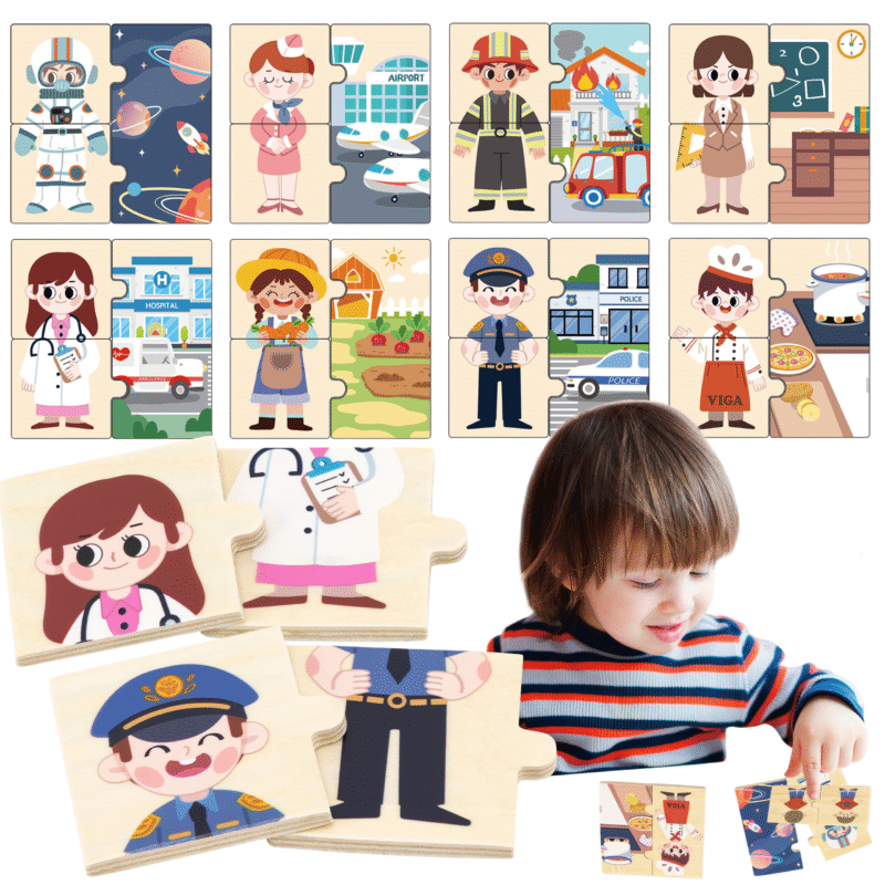 Drewniana Układanka marki VIGA pozwoli odkryć 8 zawodów oraz ich miejsc pracy z tym zestawem 24 kolorowych puzzli. Dzięki zabawie małe dzieci rozwiną swoje słownictwo. koncentrację, zdolności motoryczne i logiczne myślenie poprzez dopasowanie i odkrywanie połączeń. Połącz odpowiedni zawód z miejscem jego wykonywania.