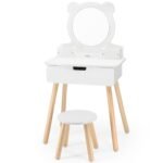 Duża, wolnostojąca biała toaletka od Viga to wymarzony mebel w pokoju każdej dziewczynki. Toaletka posiada wysuwaną szufladę, w której mała księżniczka może schować swoje skarby. Pod samym lustrem znajdują się przegródki na poręczne akcesoria. W zestawie znajdziemy również krzesełko do toaletki. Całość wykonana z drewna i pomalowana nietoksycznymi farbami bezpiecznymi dla dzieci i środowiska.