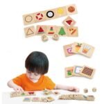 Drewniana układanka do nauki i sortowania kształtów. Zadaniem dziecka jest przyporządkować przedmioty do wybranych kształtów. Obrazki przedstawiają wiele przedmiotów codziennego użytku tj. doniczka, kawałek pizzy. Dziecko spoglądając na doniczkę ujrzy w niej kształt trapezu, natomiast kawałek pizzy będzie trójkątem. Całość wykonana jest z drewna i pomalowana nietoksycznymi farbami. W dołączonej instrukcji propozycje wariantów dla jednej osoby jak i kilku osób oraz w zróżnicowanym poziomie trudności.