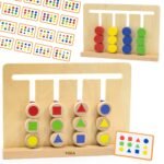 Gra Logiczna Odwzoruj Kolory i Figury od marki Viga zapewni wiele godzin zabawy! Stojąca ramka do gry posiada 12 dwustronnych klocków. Gdy już dziecko opanuje łatwiejszą stronę z kolorowymi klockami, może zwiększyć sobie poziom trudności poprzez zabawę na drugiej stronie z kolorowymi figurami geometrycznymi. Zadaniem dziecka jest posortowanie klocków lub odwzorowanie wzoru z karty, by jednak tego dokonać musi rozplanować kolejność ruchów.