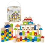 Kolorowe Klocki Drewniane od firmy Viga zgodne z duchem Montessori to 100 edukacyjnych elementów, w skład którego wchodzą  literki, cyferki oraz znaki dodawania, odejmowania i mnożenia. To idealne rozwiązanie, aby Twoje dziecko poprzez zabawę nauczyło się alfabetu i liczenia do 10. Prawdziwa frajda dla każdego malucha. Dziecko bawiąc się będzie mogło nabierać różnych umiejętności przydatnych w codziennym życiu. Klocki wykonane są z drewna i pomalowane żywymi kolorami dzięki czemu przyciągną uwagę każdego malucha. Brak ostrych krawędzi sprawia, że produkt jest w 100% bezpieczny dla Twojej pociechy. Różnorodność kształtów pozwala na budowanie niepowtarzalnych budowli, miast i obiektów. Klocki opakowane są w plastikowe wiaderko z rączką co ułatwi przenoszenie ich w dowolne miejsce. Do zestawu dołączona jest również książeczka, która zainspiruje dziecko do kreatywnej zabawy.