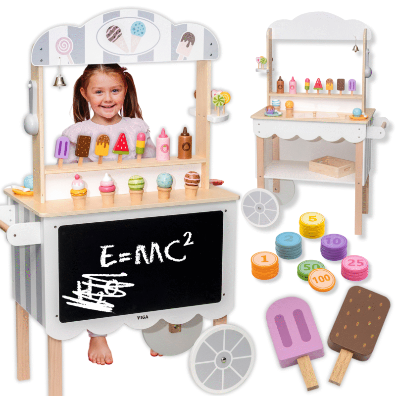 Sklep, Cukiernia, Lodziarnia 3w1 jest doskonałym prezentem dla małych cukierników. Zestaw jest idealny dla dziecka, które chce wcielić się w rolę sprzedawcy czy cukiernika. Dzięki tej zabawce dziecko poczuje się jak profesjonalny sprzedawca słodkości. Zabawka posiada wiele drobniejszych akcesoriów takich jak lizaki, lody, wafelki czy polewy. Dodatkowo sklep posiada tablicę, na której dziecko może malować czy pisać ceny lub dzisiejsze menu. W sklepie znajduje się półeczka, na której można chować różne rzeczy. Całość pomalowana jest nietoksycznymi farbami w łagodnej kolorystyce przyciągającej uwagę dziecka.