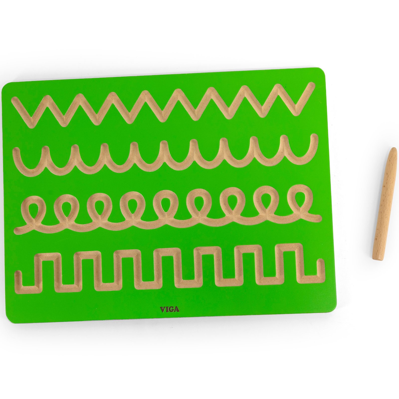 Tablica kreślarska od marki VIGA to idealna propozycja dla dzieci do trenowania rączki przed nauką pisania. Delikatnie wygrawerowane i zakrzywione rowki sprawiają, że idealnie nadaje się dla dzieci do kontrolowania ruchu dłoni i kształtowania pamięci mięśniowej poprzez wielokrotne śledzenie. Tablica jest dostępna w kompaktowych rozmiarach, dzięki czemu dzieci mogą ją trzymać i używać na stole lub biurku.Dziecko poprzez zabawę uczy się ruchów odpowiedzialnych w przyszłości za rysowanie i pisanie, kształci płynność ruchów oraz ćwiczy koordynację wzrokowo – ruchową.