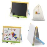 VIGA Tablica Magnetyczna 2w1 z Akcesoriami to wspaniały i wielofunkcyjny produkt, który zachęci dzieci do malowania, rysowania i pisania. Dwustronna tablica w zestawie zawiera: 26 magnesów z literkami, 10 cyfr, 29 magnesów z figurami geometrycznymi, 10 kart z instrukcją, zestaw kred, gąbeczkę do wycierania tablicy, marker, rolkę papieru oraz worek do przechowywania wszystkich akcesoriów. Tablica jest prosta w montażu, dzięki czemu łatwa w przechowywaniu oraz w transporcie. Z jednej strony znajduje się tablica kredowa, a z drugiej magnetyczna (z funkcją pisania markerem). Dodatkowo tablica posiada rolkę z papierem, którą może nałożyć na tablicę i dowolnie rysować. Te wszystkie funkcje tablicy zachwycą każdego malucha. Dziecko może korzystać według własnych upodobań i chęci. Kolory i kształty magnesów pozwolą na kreatywną zabawę. Ta tablica na pewno pobudzi wyobraźnie twojego malucha.