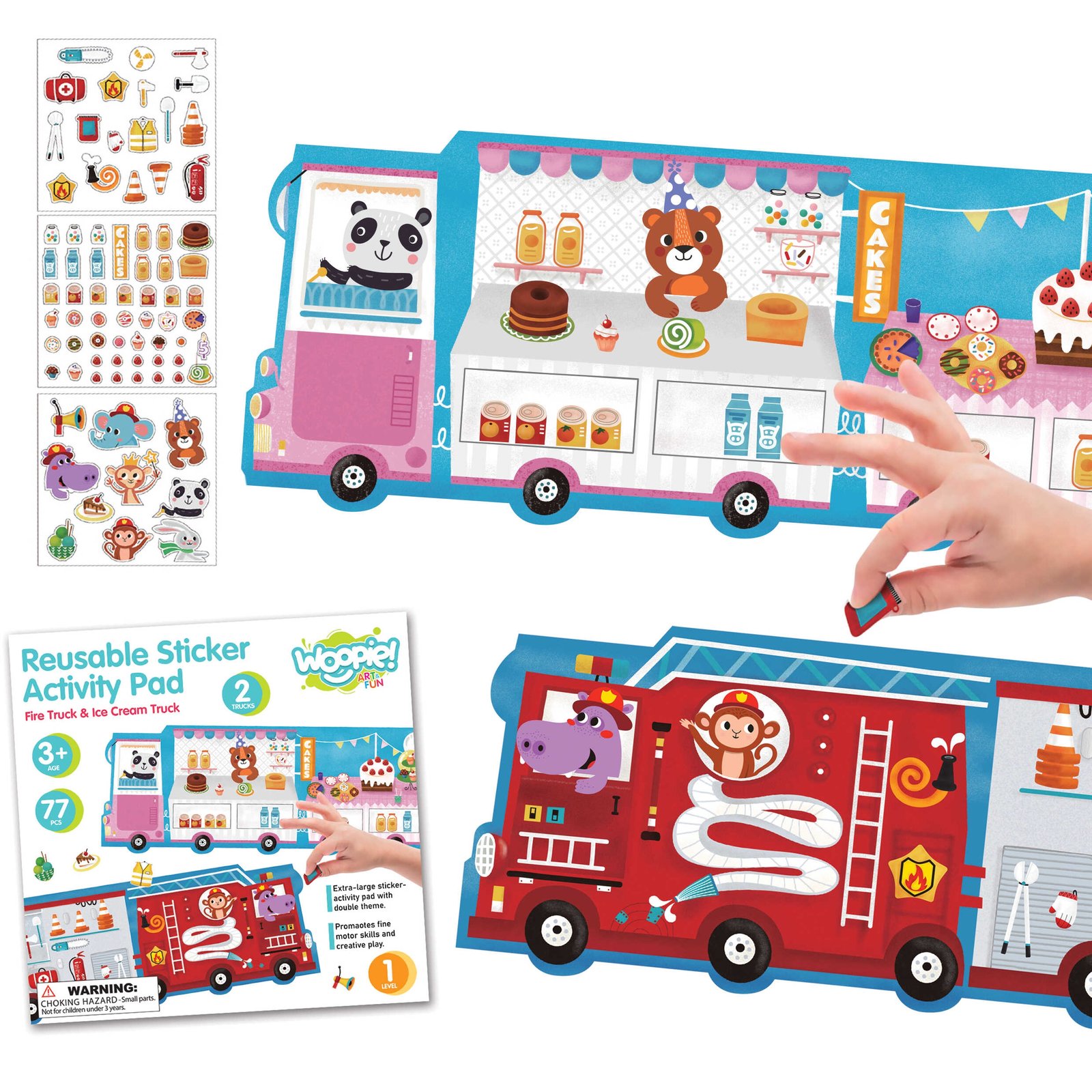 Zestaw Kreatywny Wyklejanka od marki WOOPIE z serii ART&FUN pobudzi kreatywność do granic możliwości! Stwórz swoje własne obrazy! Zestaw zawiera dwustronną plansze do oklejenia oraz 76 naklejek. Jedna strona planszy to wóz strażacki, a druga to lodziarnia. Do wozu można dokleić takie elementy jak wyposażenie wozu np. gaśnica, apteczka czy małpka strażak, a na lodziarnie różnego rodzaju desery i nie tylko. Dziecko samo decyduję, gdzie umieścić dany element – wyobraźnia jest jedynym ograniczeniem! Naklejki są do wielokrotnego użytku, łatwo umieścić i zdjąć naklejkę z planszy – bez kleju i nożyczek. Zabawka w tworzenie własnego obrazu rozwinie zdolności motoryczne oraz pobudzi kreatywność i wyobraźnie!
