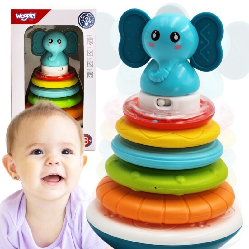 Interaktywna piramidka od marki WOOPIE to fantastyczna zabawka przeznaczona dla maluchów od 6 miesiąca życia, która dostarcza nie tylko radości, ale także wspiera rozwój dziecka na wielu płaszczyznach. Całość piramidy usytuowana jest na niewywrotnej podstawie, specjalnie zaokrąglonej, dzięki czemu piramidka to także klasyczna wańka-wstańka – wieża będzie się wesoło bujać za dotknięciem ręki. Nie tak łatwo ją przewrócić, a za jednym dotknięciem będzie się kołysać uruchamiając przy tym dźwięk grzechotek. Kolorowe ringi po zdjęciu z pałąka mogą służyć jako oddzielna zabawka – kolorowa grzechotka- idealna dla małych rączek. Zabawa polega na układaniu na pałąku obręczy od największej do najmniejszej uruchamiając przy tym zabawne dźwięki. Całej zabawie dziecku będą towarzyszyły światła, wesołe melodyjki i dźwięki. Dodatkowo w czasie gdy zabawka nie jest używana słonik wydaje zachęcające dźwięki do zabawy, a samo naciśnięcie słonika także aktywuje różne melodyjki i śmieszne dźwięki.