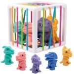 - – w zestawie: kostka-sorter + 5 miękkich klocków sensorycznych-dinozaurów,