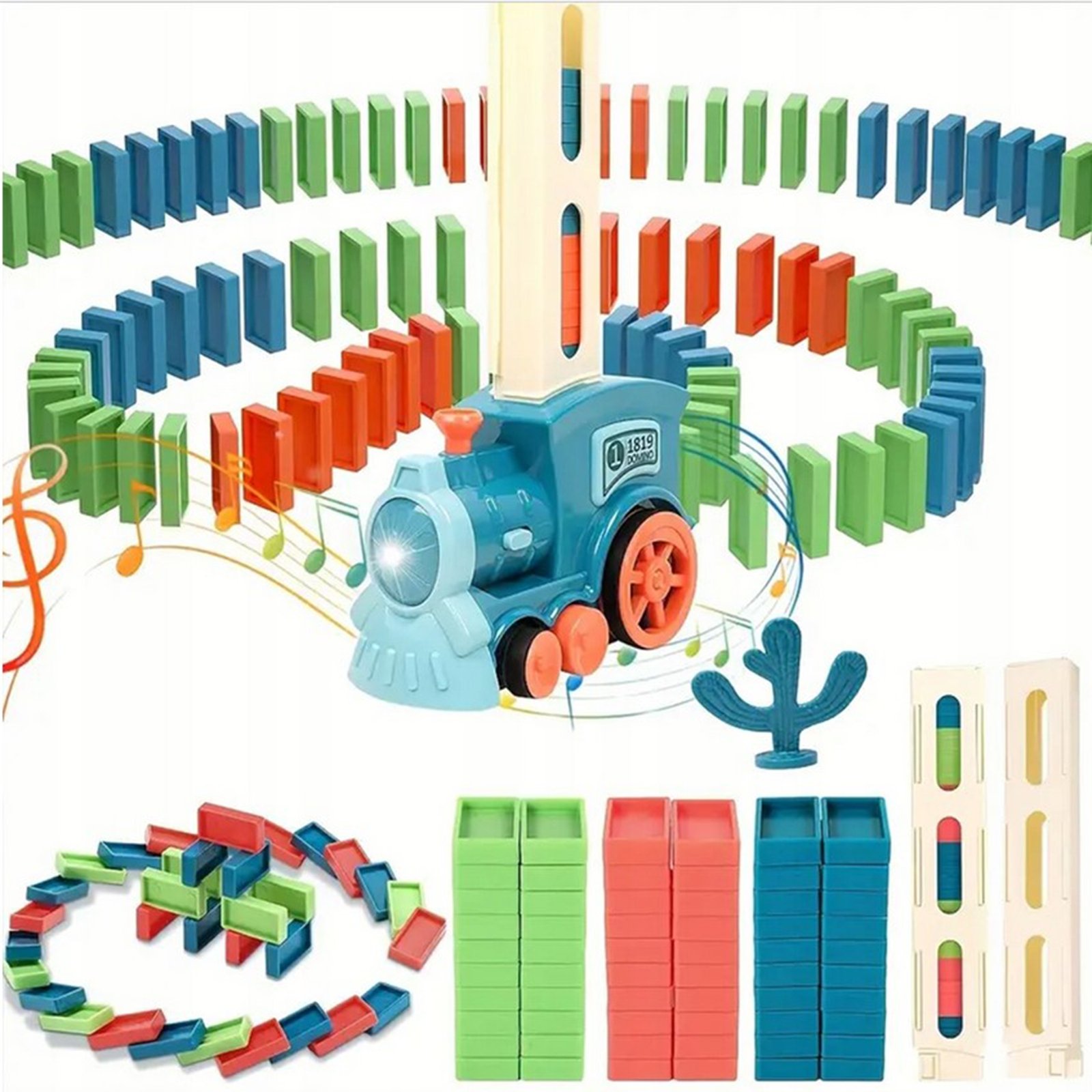 Elektryczna Ciuchcia Lokomotywa do Klocków Domino od marki WOOPIE zachwyci każde dziecko. Pociąg posiada fantastyczną funkcję. Wystarczy naładować magazynek klockami, umieścić w ciuchci, wcisnąć guzik i pociąg automatycznie stawia za sobą klocki w układzie domino. Guzikiem można zarówno włączyć i wyłączyć ciuchcie, a kolorowym kominem skręcać. Podczas jazdy zabawka świeci oraz wydaje dźwięki naśladujące prawdziwy pociąg. Młodsze dzieci lubią natychmiast przewracać klocki, natomiast starsze zaciekawi przewracanie klocków w całym efekcie domina. Zestaw zawiera aż 63 elementy, w tym komin, który ma funkcję zmiany kierunku upadania klocków oraz tworzenia bardziej skomplikowanych tras. Zabawka nie tylko dostarczy świetnej zabawy, ale również uczy. Rozwija w dziecku związek przyczynowo-skutkowy, zdolności manualne oraz wspomaga koncentracje, wyobraźnie i kreatywność.