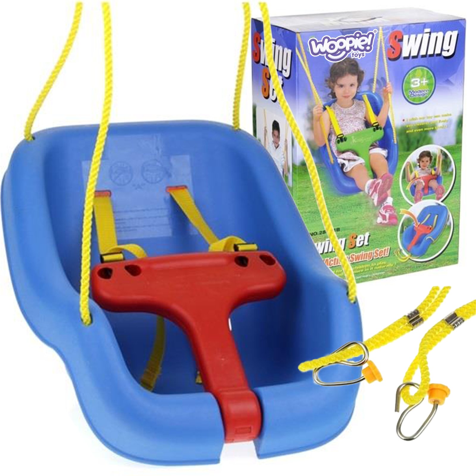 Huśtawka dla maluchów od marki WOOPIE gwarantuje bezpieczną i beztroską zabawę! Huśtawkę można zawiesić zarówno w domu, jak i w ogrodzie. Specjalnie zaprojektowane zabezpieczenia, takie jak pas bezpieczeństwa, wysokie oparcie oraz regulowane siedzisko zapewniają komfort i bezpieczeństwo maluchów podczas zabawy. Huśtawka posiada szerokie siedzisko i otwory na nogi, co ułatwia dzieciom wejście i wyjście. Co więcej, produkt jest dostarczany z liną zakończoną hakami, co ułatwia montaż, a możliwość demontażu niektórych elementów pozwala dostosować fotelik do wieku dziecka.
