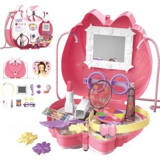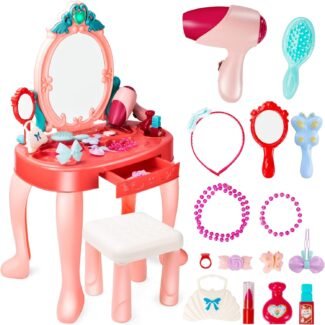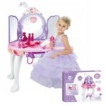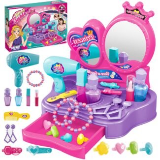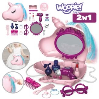 Śliczna dziecięca toaletka w dziewczęcej kolorystyce od Woopie to idealna propozycja na prezent dla dzieci od 3 roku życia. Rozbudowany zestaw do robienia makijażu oraz fryzur zadowoli każdą posiadaczkę. Skrzydła lustra otwierane za pomocą magicznej różdżki, która działa na podczerwień, tak aby dziewczynka mogła poczuć się jak prawdziwa wróżka. Na lusterku pokazuje się postać królewny. Toaletka wyposażona jest również w efekty dźwiękowe i świetlne. Podczas otwierania lusterek gra muzyczka i migają światełka, natomiast gdy dziecko nie używa toaletki lustra automatycznie zamykają się. Lustro wykonane jest z niezbijalnego tworzywa co zwiększa bezpieczeństwo dziecka. Dołączona do zestawu suszarka do włosów na baterie pomoże stworzyć bajeczne fryzury i przenieść w świat małych modelek. Zabawka może służyć jako uzupełnienie Salonu Urody małych dziewczynek w pokojach. W zestawie kabel MP3, dzięki czemu podczas zabawy można słuchać ulubionej muzyki.