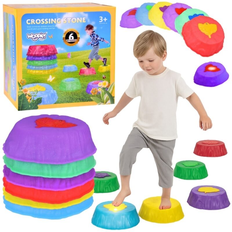 Zestaw Świecących kamieni od marki Woopie to fantastyczna propozycja dla małych poszukiwaczy przygód! 10 kolorowych, świecących kamieni równoważnych pozwala stworzyć tor przeszkód niczym z bajki – zarówno w domu, jak i na świeżym powietrzu. Wchodzenie, przeskakiwanie i balansowanie rozwija u dziecka motorykę, równowagę oraz koncentrację – a przy tym dostarcza mnóstwo frajdy!