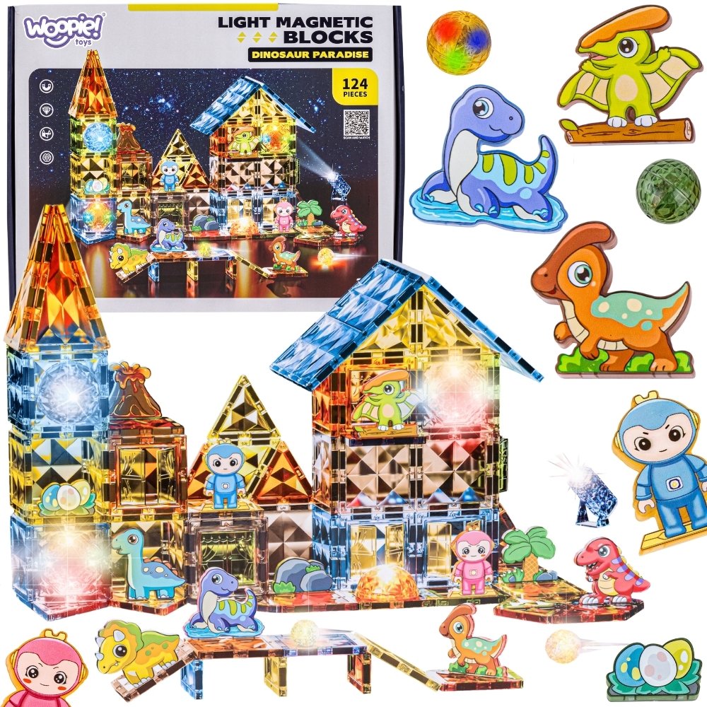 Odkryj magiczny świat dinozaurów z zestawem Świecących Klocków Magnetycznych 3D od marki Woopie! Ten unikalny zestaw konstrukcyjny to prawdziwy raj dla małych budowniczych. Dzięki magnetycznym elementom, które świecą w ciemności, dzieci mogą stworzyć niesamowite budowle, bazy i królestwa dla swoich ulubionych dinozaurów. To doskonała zabawka, która łączy naukę z zabawą, rozwijając wyobraźnię i umiejętności inżynierskie Twojego dziecka. Zbudujcie wspólnie bajkowy świat pełen prehistorycznych przygód!