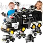 Duży Zestaw Policyjny Ciężarówka + 4 Auta od Marki Woopie Zaprojektowana z myślą o małych pasjonatach Policji, ta zabawka 5 w 1 to idealny zestaw dla każdego małego ratownika! Naciśnij przycisk na górze kabiny ciężarówki, aby zobaczyć jasne migające światła i usłyszeć realistyczne syreny, bardzo atrakcyjne dla dzieci. Zestaw zawiera dużą ciężarówkę transportową oraz cztery pojazdy policji: samochód opancerzony, ciężarówkę z armatką wodną, helikopter, radiowóz. Każdy z pojazdów ma ruchome elementy, które pozwolą Twojemu dziecku poczuć się jak prawdziwy bohater podczas akcji ratunkowych! Zestaw jest świetnym pomysłem na prezent urodzinowy, świąteczny czy na inne okazje.