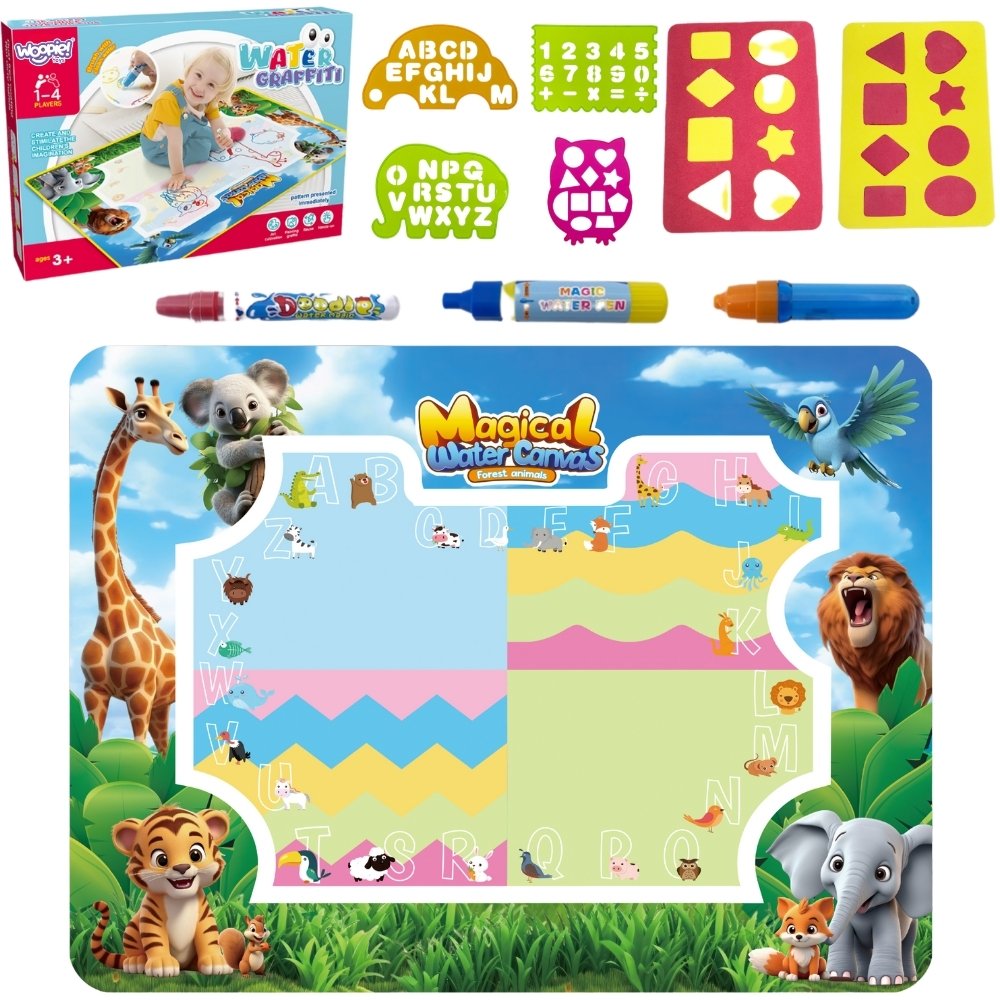 Mata do Malowania Wodą marki WOOPIE to edukacyjny zestaw artystyczny dla dzieci od 3 roku życia. Wystarczy napełnić dołączone pisaki czystą wodą, by odkrywać kolory, litery, liczby i kształty bez użycia tuszu i farb. Rysunki pojawiają się na chwilę, a po wyschnięciu znikają, zapraszając do kolejnej zabawy. Duży format 100×75 (cm) daje miejsce do wspólnego tworzenia, a wesoła grafika zwierząt z dżungli zachęca do nauki przez zabawę.